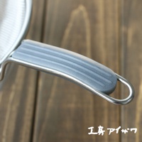 不鏽鋼濾網握柄特寫,握柄部分為灰色矽膠材質,印有日文壓紋,整體置於木質桌面。