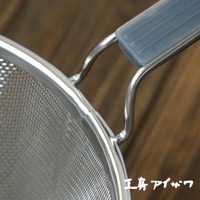 不鏽鋼濾網握柄特寫,握柄部分為灰色矽膠材質,印有日文壓紋,整體置於木質桌面。