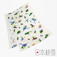 一條印有彩色恐龍圖案的白色紗布毛巾,包含藍色、綠色、粉紅色和棕色的恐龍,以及一些小樹和恐龍蛋。
