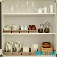 白色櫥櫃式餐盤收納架,可收納多個白色盤子,架子側面印有Richell字樣