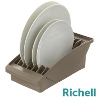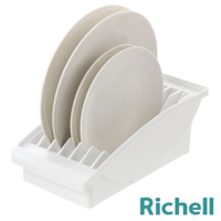 白色櫥櫃式餐盤收納架,可收納多個白色盤子,架子側面印有Richell字樣