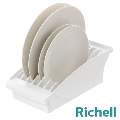 白色塑料櫥櫃式餐盤收納架,可收納多個盤子,右下方有Richell品牌標誌