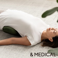 深綠色U型搖搖枕,放置於平躺的女性身下,支撐其腰部。枕頭為織物材質,表面有紋理,形狀呈弧形。
