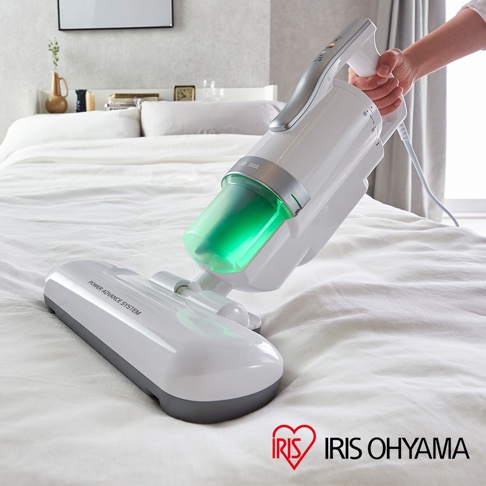 銀色雙氣旋偵測除蹣清淨機,配有綠色集塵筒,機身為白色搭配銀色握把,設有LED顯示燈,底部為白色和灰色吸頭,標示「POWER ADVANCE SYSTEM」,旁邊有IRIS OHYAMA品牌標誌。