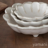 疊放的白色美濃燒沙拉盤,呈現花瓣狀邊緣,表面帶有自然的紋理和些許灰褐色細節,底部有三個小支腳。