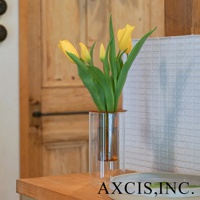 AXCIS, INC. 標誌出現在一個雙層玻璃花瓶的圖片底部,花瓶中插著黃色鬱金香,旁邊還有一個裝有白色花朵的琥珀色花瓶。