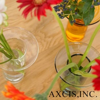 AXCIS, INC. 品牌文字出現在玻璃花瓶的圖片上,其中兩個透明玻璃花瓶裝有鮮花和綠葉。