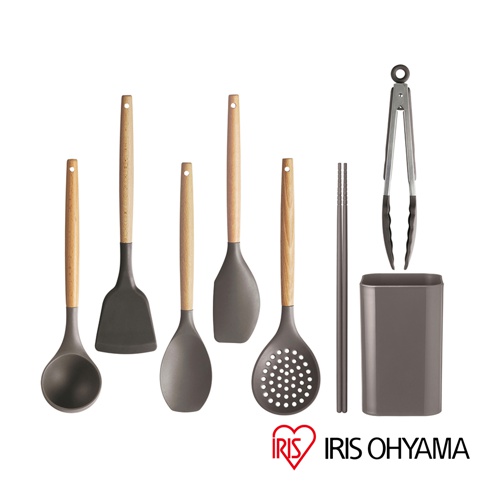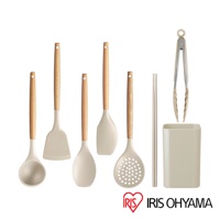 - 7件套組內容物:鍋鏟、湯匙、漏杓、淺口湯杓、抹刀、筷子、食物夾、用具收納架