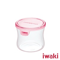 Iwaki耐熱玻璃圓形微波保鮮盒,容量240ml,透明玻璃材質,附有紅色標誌。
