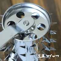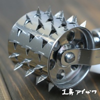 不鏽鋼製的滾輪斷筋器,滾輪表面佈滿三角形尖刺,側面有圓形孔洞,整體呈現金屬光澤。