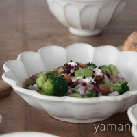 美濃燒粉引沙拉盤,21公分,白色陶瓷,帶有六瓣花形狀的邊緣,盤中盛滿色彩豐富的沙拉,包含花椰菜、紅洋蔥、堅果及芝麻。