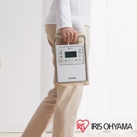 白色與金色邊框的IRIS OHYAMA強力被褥乾燥機,面板上有日文顯示與數字「60」,裝置放置於床鋪旁。