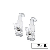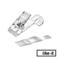 透明雙頭萬用掛式小物夾,具有掛鉤可懸掛於桿上,夾子部分可固定毛巾、沐浴球、軟管狀物品等。材質為透明塑膠,設有金屬彈簧。