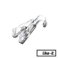 透明塑膠材質製成的雙頭掛式小物夾,一端為夾子設計,另一端為彎鉤,可用於懸掛小型物品。