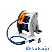 淺灰色捲盤上纏繞著深藍色水管,配有橘色提把及側邊手搖曲柄,前端連接白色藍色握把的灑水槍。