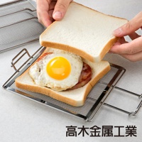 兩個烤箱用口袋吐司網夾,皆為銀色金屬材質,網狀結構,夾著金黃色烤吐司。