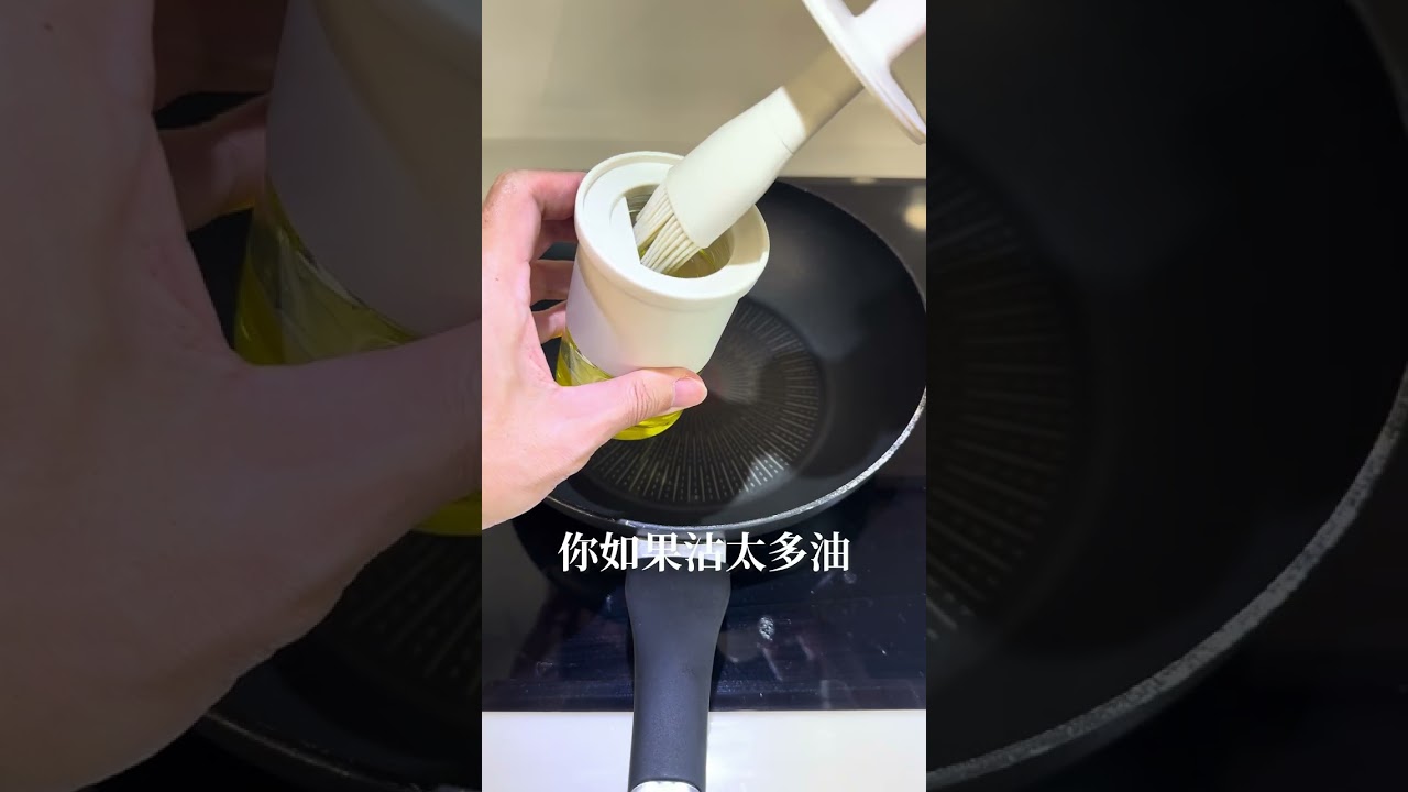 白色矽膠油刷,刷毛細密,正用於在方形平底鍋中塗抹油,鍋內有一塊金黃色的煎蛋捲。