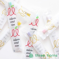 多支獨立包裝的尖頭牙刷,刷毛顏色包含粉紅、黃、紫、綠。牙刷包裝為透明塑膠袋,印有紅色、金色及銀色的「adam and eve」品牌標誌。