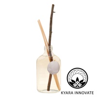 KYARA INNOVATE 擴香瓶,內有淺色香氛液和幾根擴香竹,其中一根是較粗的樹枝狀,旁邊有品牌標誌和字樣
