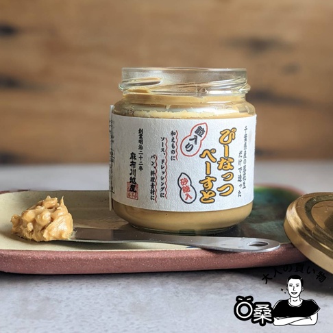 顆粒花生醬 特別選用千葉縣契作農家種植的日曬花生,少量焙煎後再以不會生熱的黑色花崗岩(日文稱黑御影石)石臼細細研磨,保留花生的香脆顆粒和最香醇濃郁的滋味,細緻如絲綢般的柔滑口感,讓人一吃難忘。