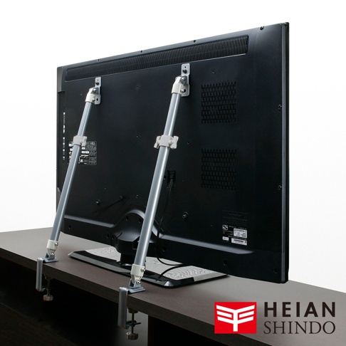 電視防傾倒固定架LEQ-45,兩組銀色金屬支架,固定於黑色電視背面,支架底部以夾具固定在深棕色桌面。