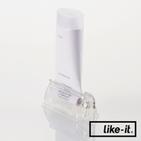 透明壓克力材質的手動轉轉擠牙膏夾,夾著一支白色印有藍色字樣的牙膏,產品結構簡潔,方便使用。