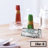 透明壓克力材質的手動轉轉擠牙膏夾,夾著綠色瓶蓋的調味料小瓶,背景有另一個紅色瓶蓋的調味料小瓶和鹽罐胡椒罐。